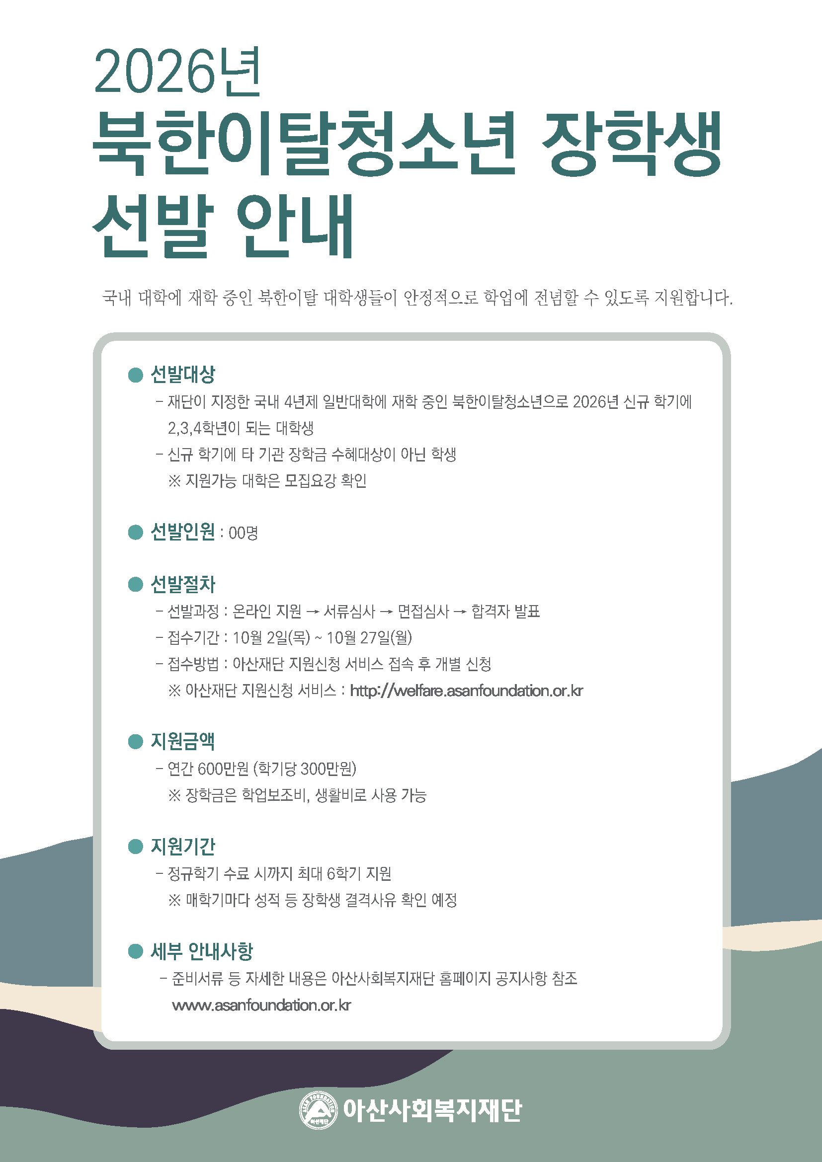 [아산사회복지재단]2026년 북한이탈청소년장학생 선발 안내