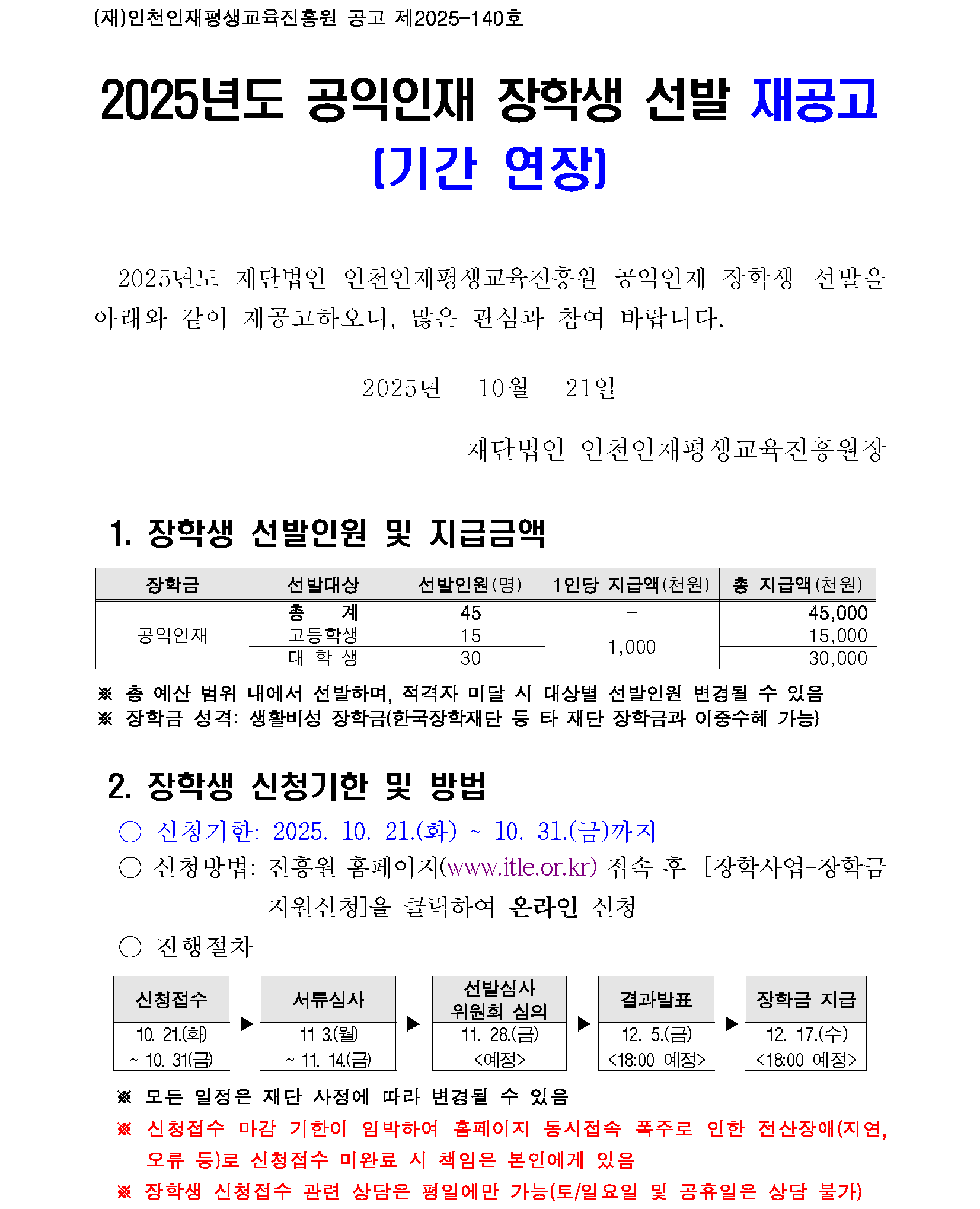 [(재)인천인재평생교육진흥원]2025년 하반기 장학생 선발 기간연장 안내